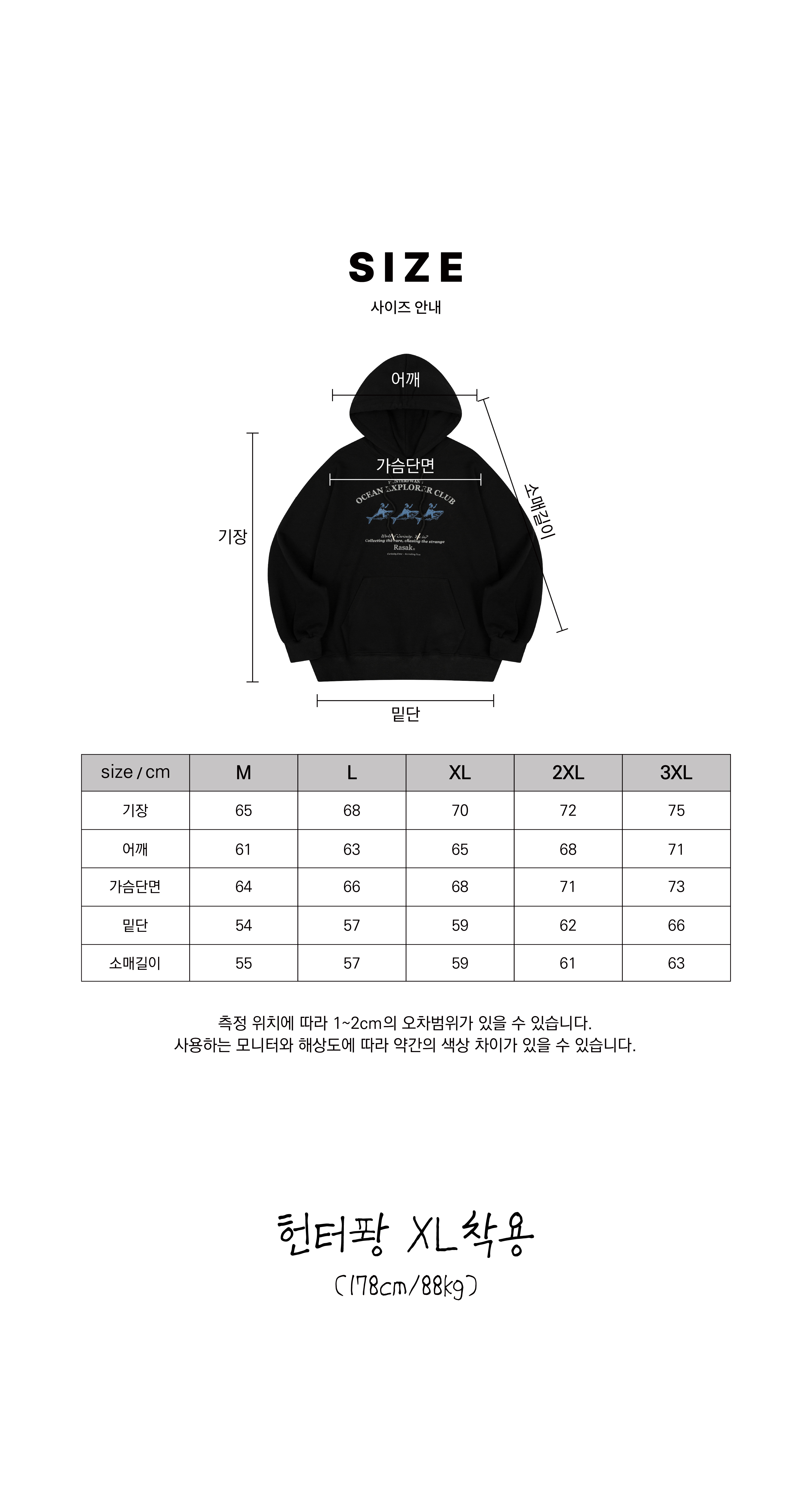 -> 헌터퐝(178/88) 기준 XL(오버핏) 2XL(루즈핏)